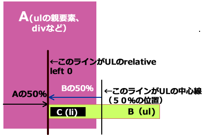つまり、1.でulはA(親要素)の50%の位置、つまり中心の位置に、ulの左端がそろい、2.でulの中心の位置が、1.のときのulの左端(つまりAの中心)に移るので、Aの中心にB(ul)の中心がそろうことになるのです。